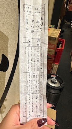 【十日ゑびすってなに⁉️】 毎年1月9日〜11日にかけて行われる、商売繁盛・家内安全を願うお祭りです。 🏮 有名な十日ゑびす 今宮戎神社(大阪):全国的に有名 西宮神社(兵庫):福男選びで有名 京都ゑびす神社(京都):花街関係者も多く参拝 だそうです!! 🔔 基本情報 主祭神:えびす様(七福神の一人) 開催日 1月9日:宵ゑびす 1月10日:本ゑびす(十日ゑびす) 1月11日:残り福 主な地域:関西(大阪・京都・兵庫など)を中心に全国 今年初のおみくじひいたの❤️ 縁起のいい末広がりの 八 👏 大吉 でも実は恵比寿さんの誕生日が 10日だから 十日ゑびすって言うらしくてね。 お店が終わるのは0時過ぎるしと ウジウジしてたけど.... いっつもあずさが 小さな声で行きたいけどどうしよ とか 欲しいけどいらんとか やりたいけどやめとこ は全部ひろってくれて ダッシュお参りが 叶ったんだよ‼️ 幸先いいよな👍 しかも末広がり大吉 しかも なんと 日付が変わった 1月11日はなんと 【残り福】 実は福が大きいんだって✨ しかもお客様とおみくじ引いた後 目の前でおみくじ買ってた人が お財布忘れはって 呼び止めて助けたよ💪 今年はさいさきいいですね👍 絶好調ですね! っていうたら その人が 【まちがいない👍】 ついでに 【こんどお店来てくださいね〜】 って営業しておきました\(^o^)/ 毎年10日というより 出勤して 0:00超えて11日の一発目に 行くのを毎年恒例にしようかな❤️ 付き合ってくれてありがとう🙏 からの 🍜つづく