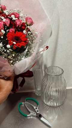 お客様からお花を頂きました✨しかも花瓶も2つ剪定バサミもセットで👏 あと滑り止めマットも! 本当に用意周到なお客様👏 早速いけました💐 綺麗で癒されます👏.·˖*·⑅♡ ありがとうございます♪