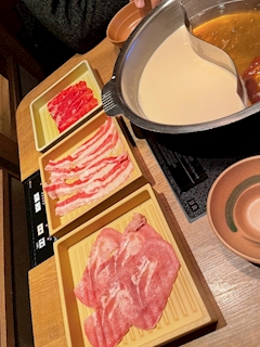 昨夜土曜日のお礼upしていきます!✍ この日は昔からのお客様とお食事からのスタート🍺✨️ お食事はお客様が探して下さってしゃぶしゃぶへ🐷💖 しゃぶしゃぶ久しぶりだったので嬉しいー!🥹 ただお写真が全然撮れてなくて😂 しゃぶしゃぶってすぐ食べるまでに出来上がるから写真撮ってる暇が全然無い🤣笑 メニューのお写真ではちっさい小鉢だったのに 到着したのはめちゃくちゃドでかいサラダだったり😳🥗笑 デザートにティラミス🍨🫧 この3枚しかお写真撮ってませんでした😂💭 でも美味しかった〜!✨️ わいわいゆっくりお話しながらのご飯楽しかったです☺️ ご馳走様でした🙏🌼 そしてお店に入ってからは嬉しいお祝いもして頂いて🍾💖 またそちらも、upします😎🥂