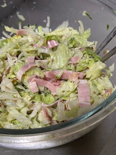 コールスローもおいしいけど最近はレタスときゅうりの千切りサラダ🥗 あとハム🐷 ドレッシングはアーモンドのあまり混ざり物がないドレッシングで✨