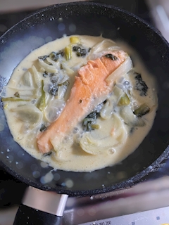 こんにちは杏です(՞ . ̫ .՞)" 自炊のお話シリーズ📓 一時期ハマってた鮭の豆乳クリーム煮👐🏻 レンチンでも作れたりするんですけどこの日はフライパンでコトコトやりたくて🍳 レンチンは加減むずくて豆乳分離やらかしたりする時もあるんですけど😂(笑) フライパンはその失敗しづらいしやっぱり安定に美味しく味染み込ませれる気もするし 時間ある時はこの方がいいのかなと🤲🏻 あとシンプルに料理の肯定好きなので楽しめる時は楽しみたいですね👨🍳 最近はお家帰る時何作って食べようかな〜😚 って楽しみにできてて自炊モチベ調子いい杏でした🤘