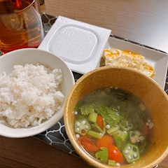 インフル後から着々と ダイエットを遂行してます🐖 1日のカロリー計算しながら 健康的に痩せる✨ この日の朝ごはんは スクランブルエッグ 納豆 セロリとおくらとトマトのスープ もち麦ご飯100g 納豆食べときゃ痩せるやろ って思ってます🙂 夏までに7キロいけるかな🤣