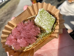 おはようございます杏です☀️ 福岡旅行の時のお写真いくつか残ってたのでそのお話でも📷 2日目にお土産買いに行ったりお散歩したり 各々別行動してたのですが合流したお友達から おやつだよ〜!!って🫶 なんばん往来って土産物で有名なおかしなのですが それを出来たてに色々トッピングしたものがテイクアウトできるらしく😳 これは春の桜抹茶仕様🌸🍵 なんばん往来、外のサクサクパイ生地と🥧 中のぎゅっとつまった餡が優しい甘さで美味しいんですよね(ᐡᴗ͈ ̫ ᴗ͈ᐡ) 見た目も可愛いしお味もね、桜クリームもマシュマロも甘すぎなくてとっても美味しかった🫶 お友達に大感謝🥳 (ちなみにくれたお友達は面白すぎるオカマちゃん、この旅行沢山お世話になりました🙌) 帰り道に小腹がすいて買ってみた辛子明太子焼売! 結構明太子の味しっかりでたれとかからしなしでもしっかり味あるし美味しかったです🫶 これと明太子おにぎり食べながら帰宅路に着きました🍙 福岡もまた行きたいししばらく行ってへん 浜松、仙台あたりまた機会作って行きたいなあ💭 (目的は食べ物ばっかりです🐷)