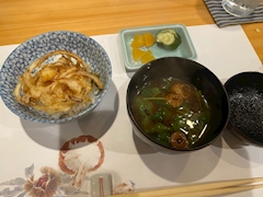おはようございます杏です☀️ 日曜日のお食事のお話ラスト! 天ぷらのコースの〆は天茶漬けか天丼か選べるのですが お客様は天茶漬け、 私は今回は天丼にしました🍤 大好きな玉ねぎのかき揚げ🧅 ご飯の量が控えめで🍚 毎回ちょうど良くて助かってる気がします😂(笑) そしてお味噌汁とお漬物って組み合わせめちゃくちゃほっとします🍵 ゆっくり楽しんでほっとした後またちょっとしたデザートが! こちらもひと口サイズやからほんまにちょうどいいコースのデザート、 今回はブドウゼリーでした🍇 さっぱりしてて美味しかった⸝⸝ᐡ. ̫ .ᐡ⸝⸝ お客様と一緒に大将の生存確認ができて良かったし😂(笑) 今回も季節の天ぷらの美味しさに大大大満足でした🍤 いつもほんまにありがとうございます、 ごちそうさまです- ̗̀ ෆ( ˶'ᵕ'˶)ෆ ̖́- お店でのお話もまた改めて💭